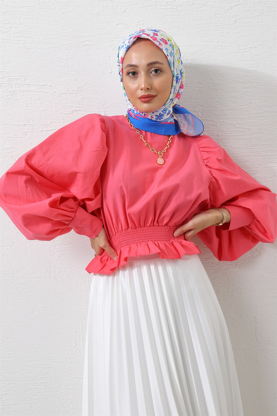 Beli Lastikli Kolları Büzgülü Gömlek Pembe