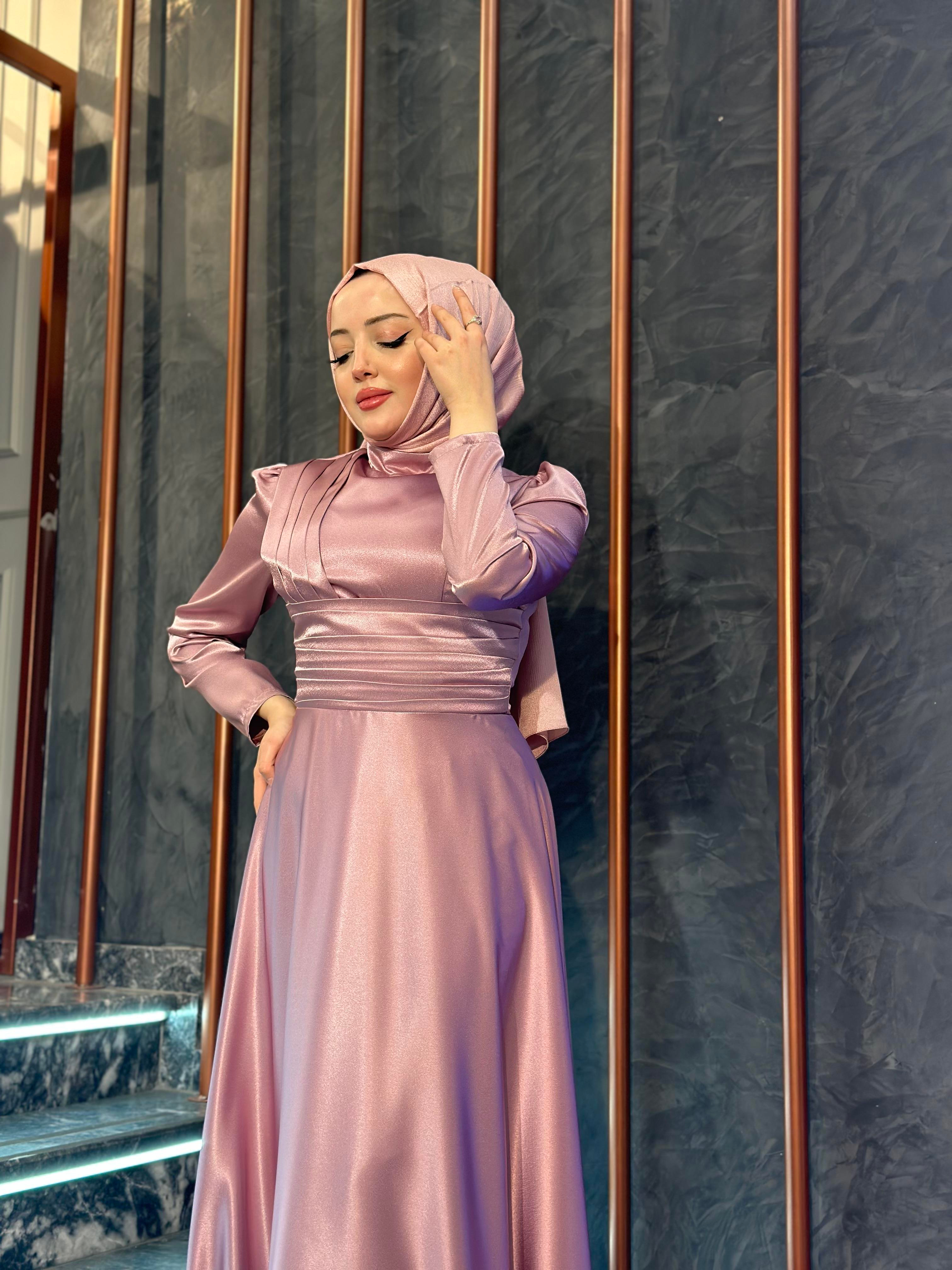 Moda Ala | Beli Pilise Detaylı Abiye Pudra ile Zarif ve Romantik Şıklık