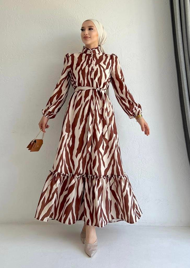 ModaAla | Etek Ucu Fırfırlı Elbise Kahverengi - Doğal ve Zarif Tasarım