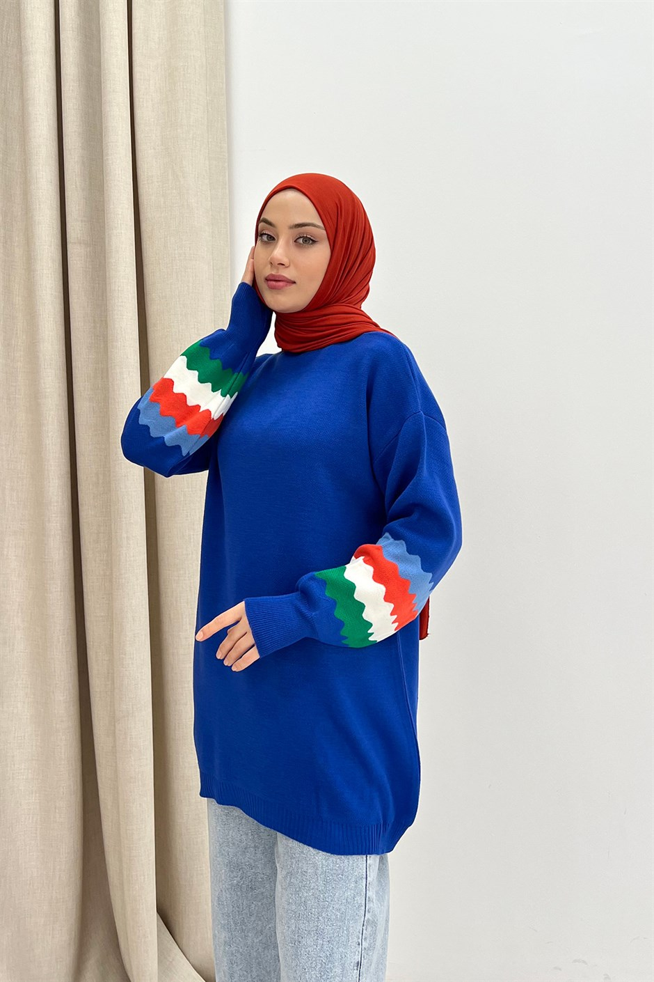 Kolları Renkli Triko Kazak Mavi (118222296201)
