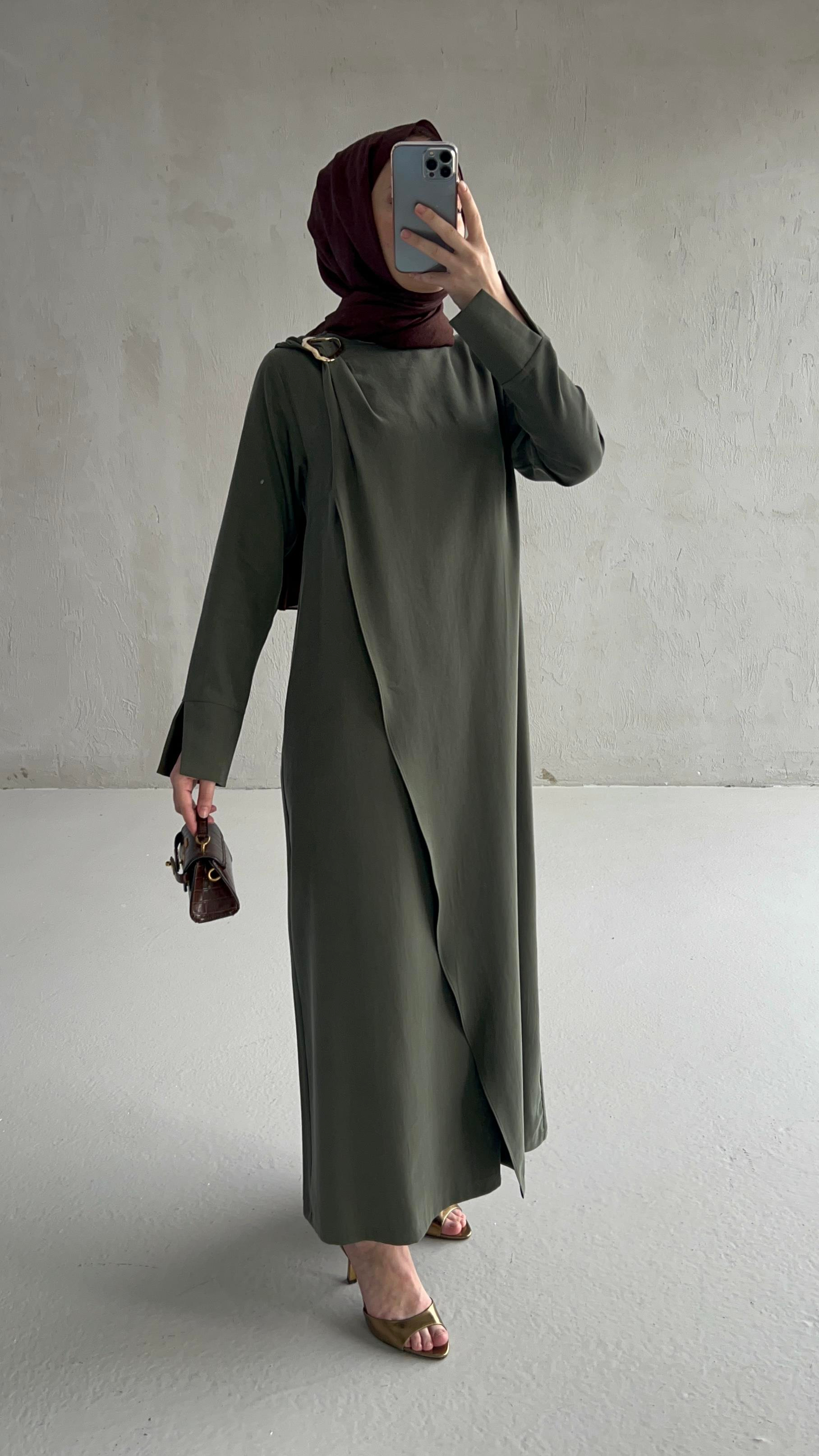 Omuz Detaylı Haki Elbise | Zarif Tesettür Elbise Modelleri - Moda AlaOMUZ DETAYLI ELBİSE Haki