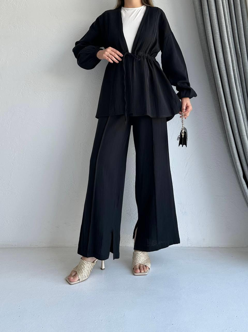 Paçası Yırtmaçlı Müslin Takım Siyah