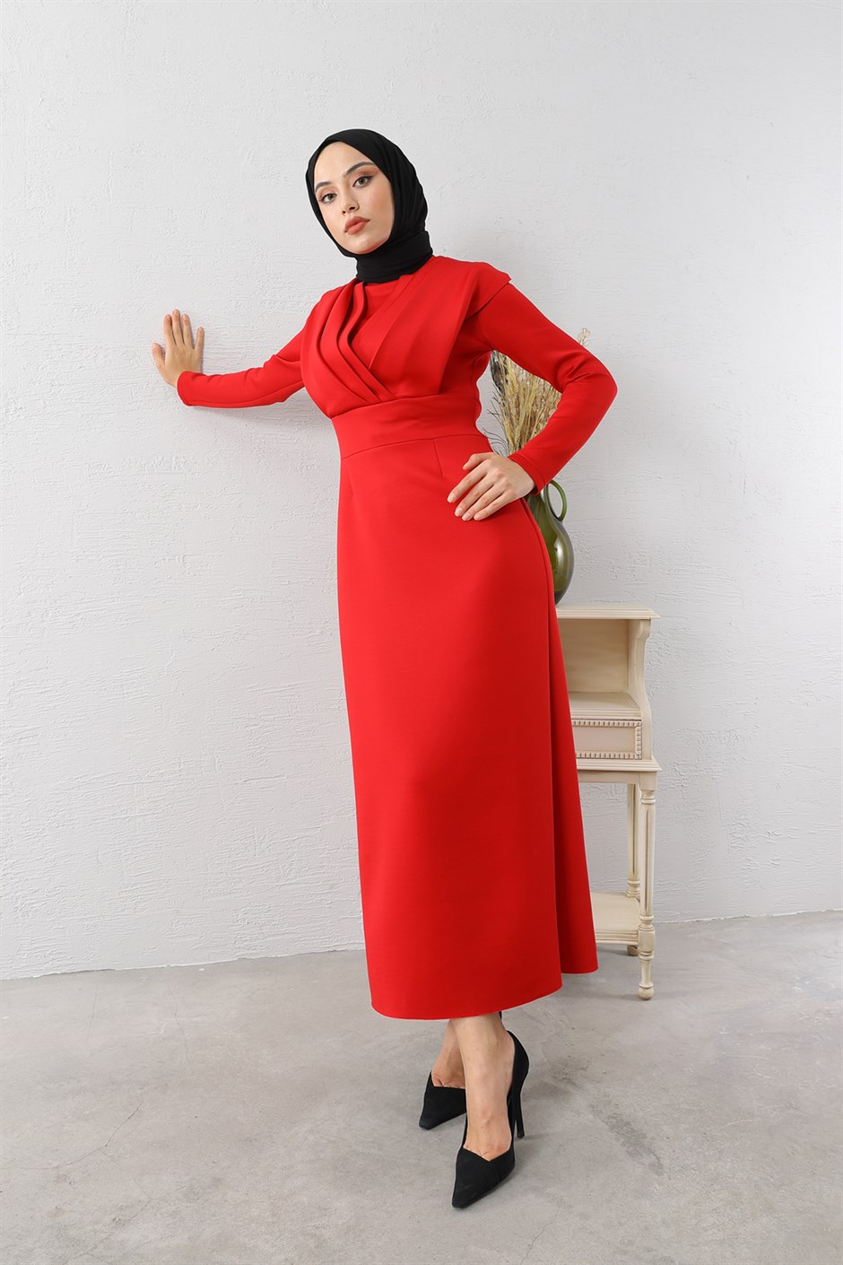Pile Yakalı Scuba Kalem Elbise Kırmızı (306222124131)