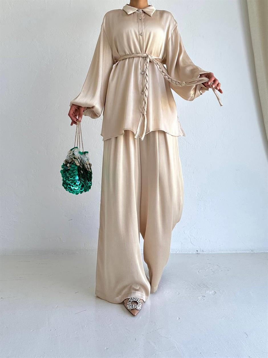 Taş Düğmeli Örgü Kemerli Takım Bej
