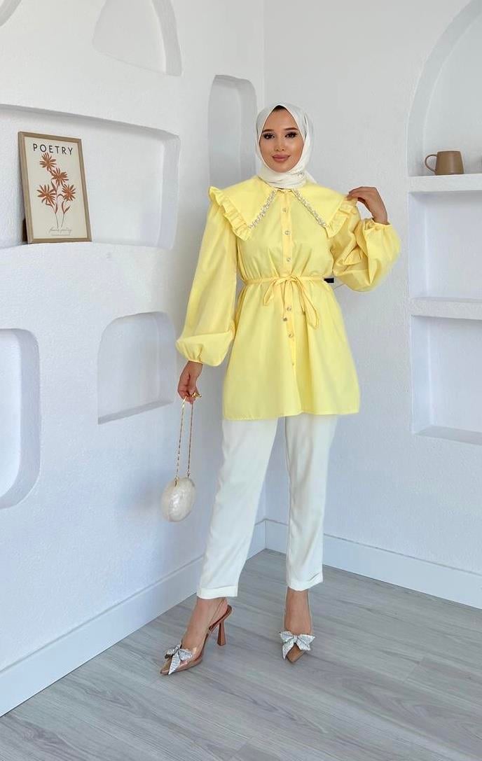 Moda Ala Yakası İşlemeli Gömlek Sarı | Şık ve Zarif Kadın Gömlek